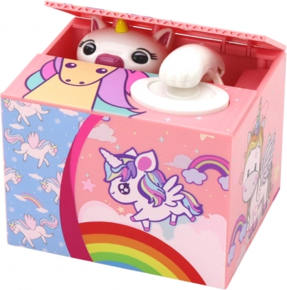 În partea de sus a pușculiței se află un buton mare alb pentru introducerea monedelor. Când copilul pune moneda pe buton și îl apasă, se aude o melodie veselă, iar din cutie, în partea superioară, iese un unicorn drăgălaș care ia moneda în interiorul pușculiței. Datorită acestui efect sonor și vizual, joaca devine și mai interesantă și motivantă.
