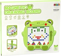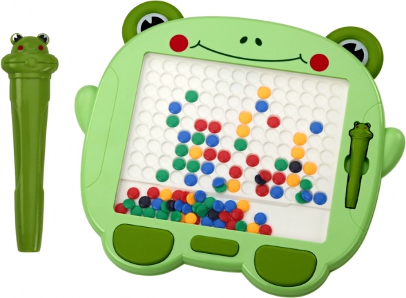 În centrul tablei se află o suprafață mare albă cu marcaje, ideală pentru aranjarea mărgelelor magnetice. Din aceste mărgele, disponibile în diverse culori – negru, albastru, galben, roșu și verde – se pot crea diferite modele și imagini. Prin peretele transparent, care protejează desenul de deteriorări accidentale, copiii își pot aranja liber compozițiile folosind un stilou magnetic special cu motiv de broscuță.