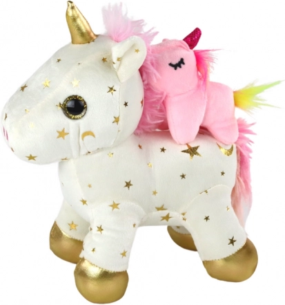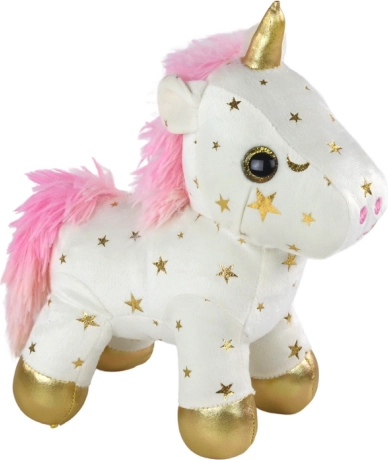 Unicornul alb cu steluțe aurii, coamă roz și copite aurii este catifelat la atingere și îmbie la îmbrățișat.