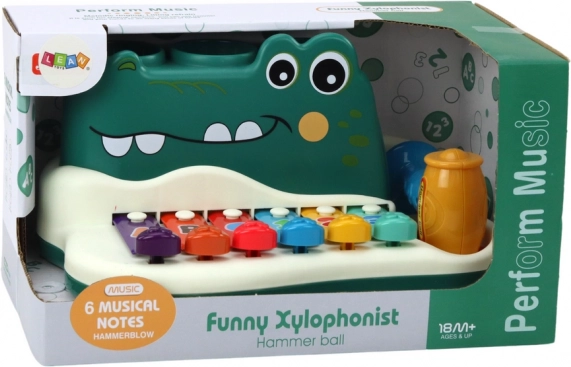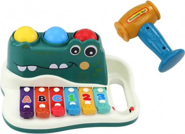 Drăgălașul crocodil îmbină într-o singură jucărie un xilofon, o pianină și o joacă interactivă cu bile. Copiii pot bate cu bagheta pe lamlele colorate, exersând motricitatea, auzul și recunoașterea numerelor și literelor. Distracție sigură, cu certificare CE și conformitate EN71, pentru copii de la 3 ani.