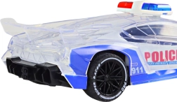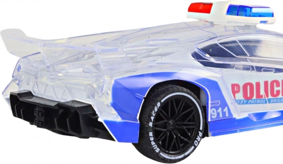 Mașină sport de poliție cu telecomandă, la scara 1:16, cu caroserie transparentă și lumini colorate. Datorită telecomenzii intuitive, permite manevre precise și gamă completă de mișcare. Respectă standardele CE și EN71, potrivită de la 3 ani; alimentare 4× AA pentru mașină și 2× AA pentru telecomandă (nu sunt incluse).