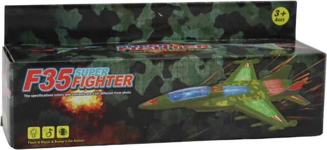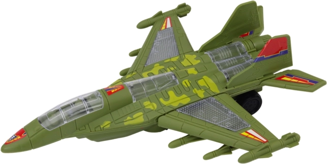 Avionul de vânătoare verde, mobil, pentru micii piloți oferă lumini clipitoare, muzică și sunete realiste ale motorului și modul bump‑and‑go, care ocolește automat obstacolele. Camuflajul realist, cockpitul transparent și construcția rezistentă din plastic asigură ore întregi de distracție. Respectă standardele CE și EN71.