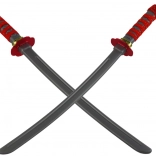 Acest set conține două replici impresionante de săbii, ale căror mânere sunt împodobite complex cu panglici roșii, conferindu-le un farmec aparte. Două pumnale adaugă colecției un element de varietate, permițând crearea unor scenarii diverse și apropiindu-vă de lumea autentică a ninja. Întregul este completat de o mască elegantă, de un negru intens, cu un motiv elaborat de dragon auriu, simbol al agilității și misterului.