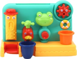 Faceți baia mai distractivă cu această jucărie interactivă de apă. Datorită ventuzelor, o fixați ușor pe cadă, turnați apă în partea superioară și puneți în mișcare elementele colorate. Copiii se vor bucura de moara de apă, fântâna, robinetul și amuzanta broscuță cu jet de apă. Ideală pentru dezvoltarea motricității și învățarea prin joc în timpul băii zilnice.