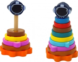 Piramida stivuibilă din lemn cu tematică spațială îmbină jocul cu învățarea. Copiii sortează cercurile colorate – „planete” – după mărime și își exersează astfel compararea, orientarea și răbdarea. Piesa finală, sub forma unei căști spațiale, adaugă satisfacția finalizării sarcinii.