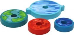 „Planetele” colorate din lemn, de mărimi diferite, îi învață pe copii să sorteze, să compare și să recunoască culorile.