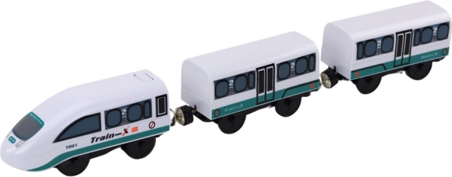 Setul Train-X cu vagoane interconectabile asigură o rulare lină pe șinele din lemn. Alimentare cu 1× AA (neinclusă).