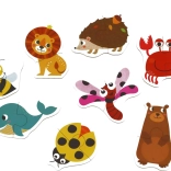 Asamblați animale complete cu piese de puzzle colorate cu ilustrații precum leu, crab sau urs. Aceste piese sunt realizate din carton și sunt concepute pentru copii.