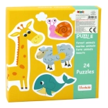 În acest set de puzzle-uri unic veți găsi 24 de animale diferite, fiecare împărțit în două piese. Sarcina copilului este să potrivească piesele astfel încât să rezulte imaginea completă a animalului. Această activitate nu doar aduce bucuria jocului, ci dezvoltă și gândirea logică, precum și coordonarea mână-ochi.