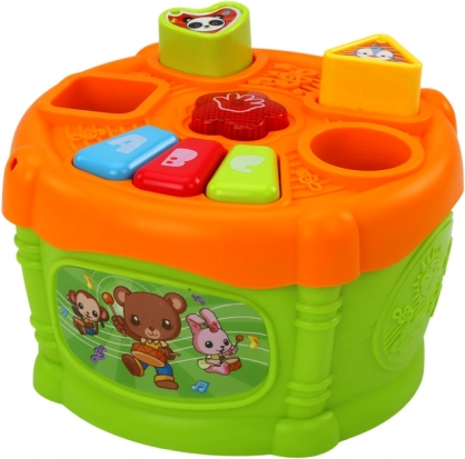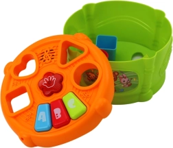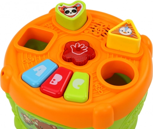 Jucăria interactivă pentru copii în formă de tobă cu un design colorat combină distracția cu învățarea. Este echipată cu deschideri pentru diverse forme geometrice și butoane marcate cu 'A', 'B' și 'C', ajutând copiii să învețe formele și literele.
