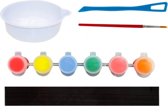 Include vas, spatulă, pensulă și șase culori pentru amestecare și aplicare. Ideal pentru activitățile de pictură ale copiilor.