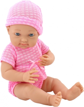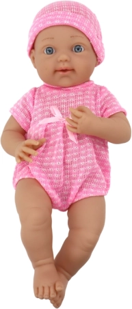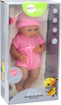 Setul textil roz cu căciuliță, trăsăturile realiste și ochii albaștri îi conferă păpușii farmec. Suzeta practică pe șnur nu se pierde și amplifică scenariile de joacă de îngrijire.
