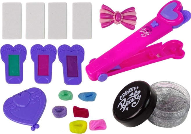 Agrafa cu fundiță, elasticele și pieptenele permit decorarea coafurilor și accentuarea efectului colorat. Oglinda ajută la verificarea rezultatului final.