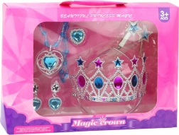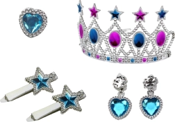 Setul include o coroană decorată cu imitații de diamante în două culori superbe: albastru și roz. Această coroană nu doar adaugă strălucire, ci devine și un simbol al unicitații pe care vrea să o simtă orice mică prințesă.