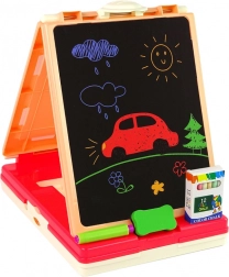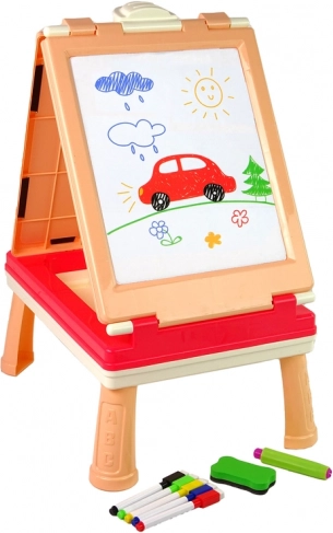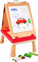 Susțineți imaginația și învățarea copiilor cu această tablă universală 3‑în‑1. O față este destinată desenului cu cretă, cealaltă pentru scris și desen cu markere lavabile. Datorită măsuței solide, totul este stabil, iar copiii au la îndemână accesoriile și planșele de joc.