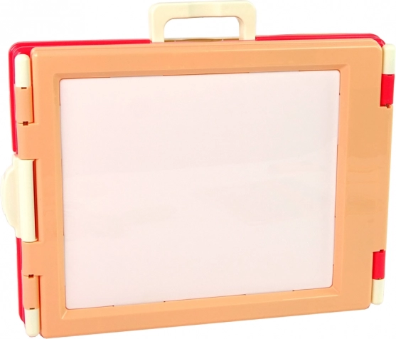 O față pentru cretă, pentru desen clasic, cealaltă lavabilă pentru markere colorate – ideală pentru creativitate și exersarea abilităților școlare.