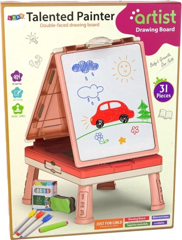Tabla multifuncțională pentru copii 3‑în‑1 îmbină desenul creativ și învățarea distractivă într-un singur produs. Oferă o suprafață cu două fețe pentru cretă și markere, o măsuță practică și jocuri de societate integrate, precum „Nu te supăra, frate” și Șerpi și scări. O alegere excelentă pentru dezvoltarea creativității, motricității fine și gândirii logice la copiii de la 3 ani.