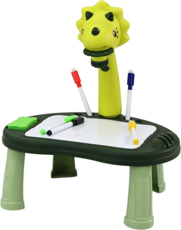 Acest proiector pentru copii în formă de dinozaur proiectează imagini pe o suprafață albă, astfel încât cei mici pot trasa cu ușurință și învăța să deseneze. Casetele cu discuri rotative oferă în total 24 de motive, care inspiră crearea de desene și colaje. Măsuța joasă, robustă, este concepută pentru o poziție comodă și servește și ca suprafață de joc.