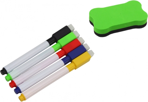 Markere colorate ștergibile și un burete practic permit corecții rapide și noi încercări – ideal pentru creații zilnice fără dezordine.