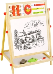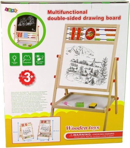 .Tabelă de desen educativă cu două fețe, cu abac, ceas și alfabet, este un instrument excepțional de dezvoltare pentru cei mici. Este realizată din lemn masiv, oferind durabilitate și siguranță în timpul jocului. Construcția sa pivotantă permite utilizarea a două suprafețe diferite: una acoperită cu material negru, ideală pentru desen cu cretă, și cealaltă, albă, perfectă pentru desen cu markere.