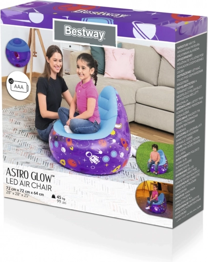 Fotoliul gonflabil Bestway cu motive spațiale transformă orice cameră de copii sau sală de joacă într-o zonă plină de distracție. Iluminarea LED integrată creează o atmosferă plăcută pentru citit, joacă și relaxare. Datorită greutății reduse, fotoliul este ușor de transportat și potrivit și pentru terasă sau grădină.