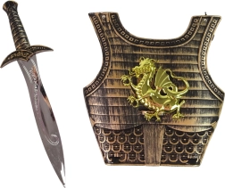 Set complet de costum de samurai pentru copii, include armură de aur cu motiv de dragon, care se adaptează ușor datorită curelelor elastice. Costumul este echipat cu o sabie confortabilă cu diverse modele pe mâner și un arc pentru tir precis la distanță.