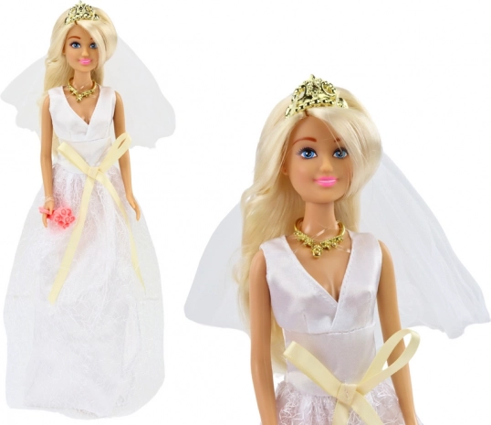 Păpușa ține un buchet de trandafiri roz, sporind aspectul său autentic. Părul ei lung blond este îngrijit aranjat și acoperit de un voal care cade ușor pe spate.