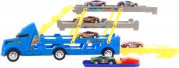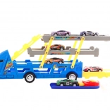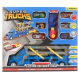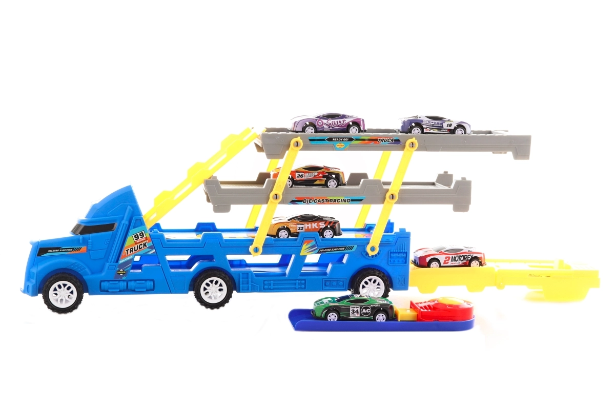- Set complet – camion mare + 6 mașinuțe de curse + platformă de lansare.