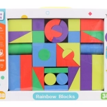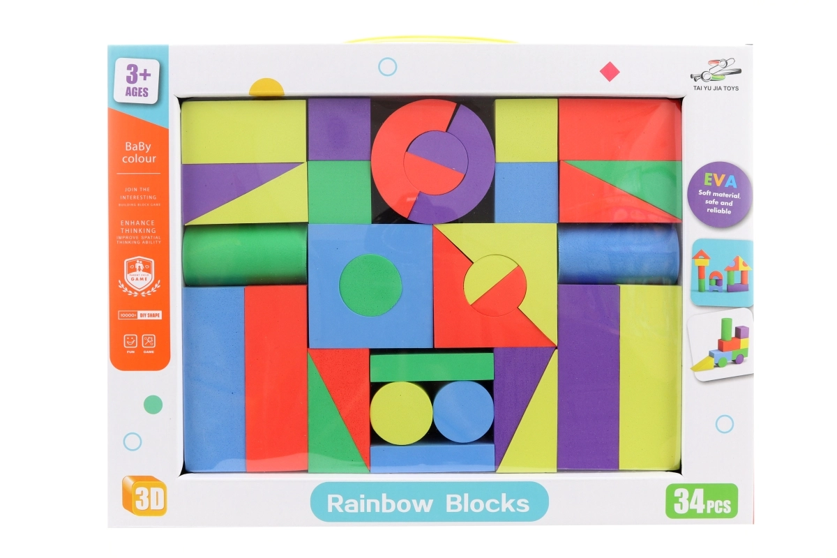 Cărămizi din spumă mai dură, de forme și culori diferite. Ambalate în cutie. Dimensiunile ambalajului aprox. 37,5x26,5x4,5 cm. Vârsta 3+
