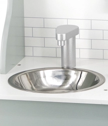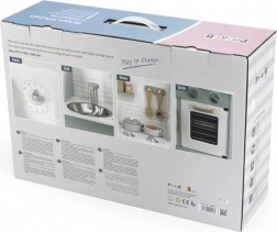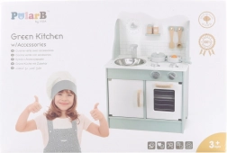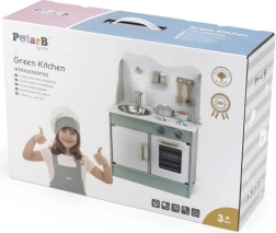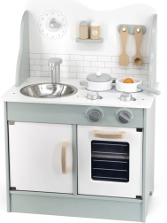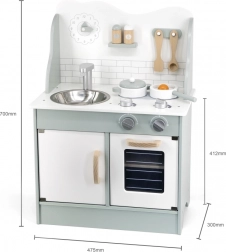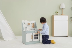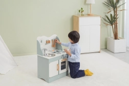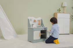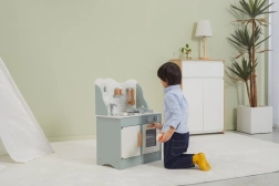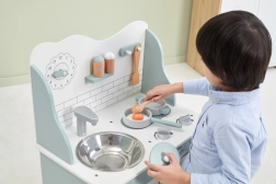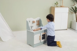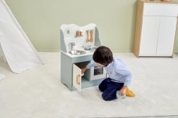 După terminarea gătitului, copiii pot spăla vasele în chiuvetă și depozita alimentele în dulapul de depozitare sub chiuvetă. Bucătăria este realizată din lemn lăcuit și vopsită cu culori netoxice în nuanțe polare. Susține responsabilitatea și organizarea în timpul jocului.