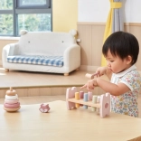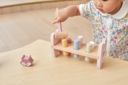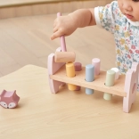 - Jocul cu ciocanul include țăruși colorați care trebuie bătuți cu ciocanul.