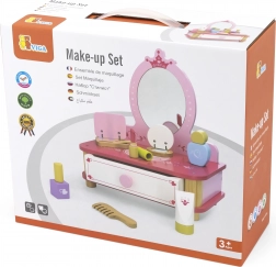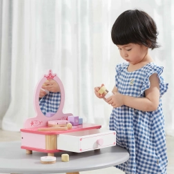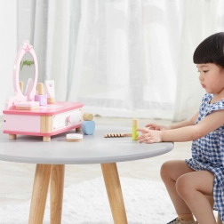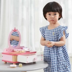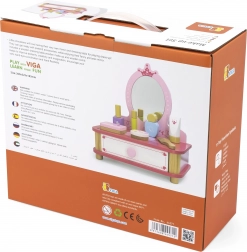 O frumoasă toaletă roz de la brandul Viga este accesoriul ideal pentru orice cameră de copil. Setul conține oglindă, sertar culisant și accesorii din lemn diverse pentru a crea o lume magică plină de fantezie. Fabricată din lemn de calitate și vopsită cu culori netoxice sigure pentru copii.