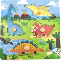 Puzzle din lemn cu dinozauri de la brandul renumit Viga sunt jucării educative ideale pentru copiii de 12 luni, care ajută la dezvoltarea motricității fine, recunoașterea formelor și coordonarea ochi-mână.
