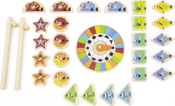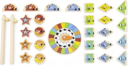 În pachet găsești 2 undițe magnetice, 26 de peștișori pestriți și o rotiță care indică culoarea sau forma capturii. Perfect pentru joc individual și pentru competiția a doi jucători.