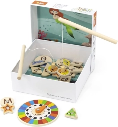 Acest joc de pescuit magnetic din lemn transformă învățarea în distracție. Copiii prind peștișori colorați cu ajutorul celor două undițe magnetice, iar rotița indică culoarea sau forma corectă a capturii. Pe spatele fiecărui peștișor se află o literă a alfabetului, astfel că, în timpul jocului, își dezvoltă și primele abilități de pre-lectură.