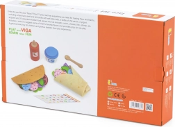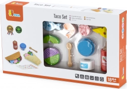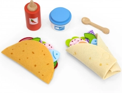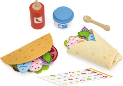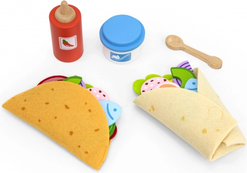 Setul VIGA pentru taco și burrito oferă copiilor o experiență autentică de gătit. Tortillele din fetru moale și bucățile colorate din lemn (legume, brânză, pește etc.) invită la combinarea aromelor și la crearea de rețete proprii. Cu accesorii precum sticla de sos, bolul de „iaurt” și lingurița din lemn, jocul devine și mai variat.