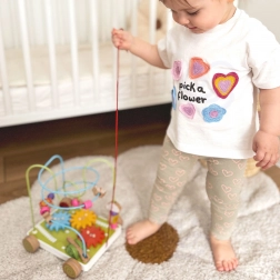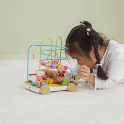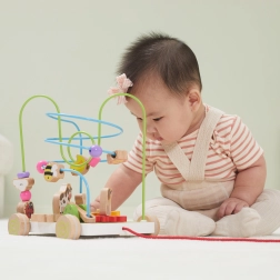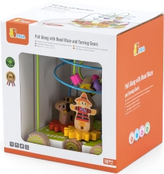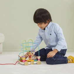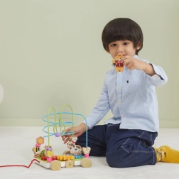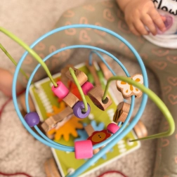 O singură jucărie, o mulțime de posibilități – copiii pot trage jucăria de șnur, pot deplasa mărgelele pe firele metalice și pot roti rotițele dințate. Combină mișcarea cu jocul senzorial.