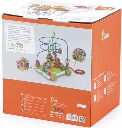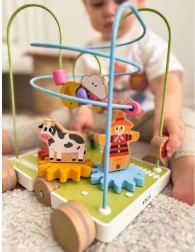 Această jucărie creativă din lemn, pe roți, le oferă copiilor nenumărate posibilități de descoperire. Pe baza solidă găsiți figurinele fermierului, ale văcuței și cățelului, o buclă motrică colorată cu mărgele, soare și fluture, precum și rotițe dințate rotative. Animăluțele se pot schimba și muta cu ușurință, astfel încât copiii își creează propriile povești și își antrenează motricitatea fină.