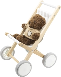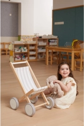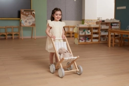 Căruciorul pentru păpuși din lemn este o jucărie atemporală care susține jocul imitativ, îngrijirea și mișcarea de zi cu zi. Construcția din lemn natural asigură stabilitate și rezistență, iar șezutul textil transportă confortabil atât păpușile, cât și jucăriile de pluș preferate.