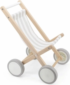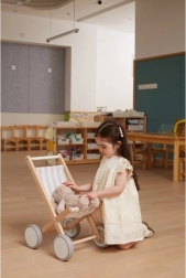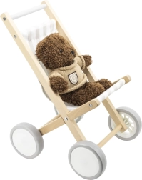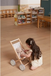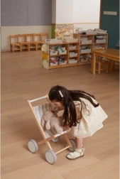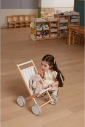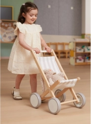 Un cărucior pentru păpuși elegant și stabil, din lemn natural, cu șezut textil. Oferă construcție solidă, roți silențioase blânde cu pardoseala și este ideal pentru dezvoltarea imaginației și a motricității copiilor începând de la 18 luni. Dimensiunile compacte 35 × 45,5 × 55,5 cm se potrivesc oricărei camere de copii.