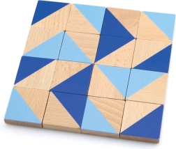 Piese geometrice variate în nuanțe de albastru și lemn natural permit alcătuirea unui număr nesfârșit de figuri și modele.
