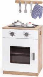 Oferiți-le copiilor propriul colțișor de bucătărie, în care pot imita gătitul ca adulții. Acest aragaz din lemn de calitate oferă două plite, butoane de control rotative și cuptor cu uși transparente pentru o joacă și mai realistă. Deasupra plitei se află o bară practică pentru agățarea ustensilelor și a mănușii.