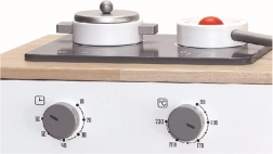 Două plite, butoane rotative și cuptor cu uși transparente îi motivează pe copii la joacă creativă și le dezvoltă imaginația.