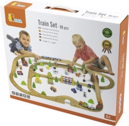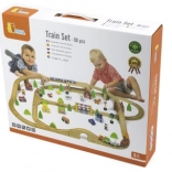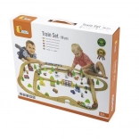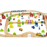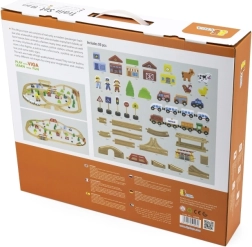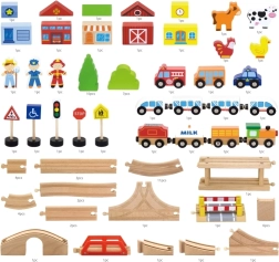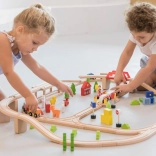 Acest circuit de tren din lemn, complex, oferă copiilor tot ce au nevoie pentru a-și construi propria lume în miniatură. Datorită celor 90 de piese, micii constructori pot combina diferite forme de șine, poduri și intersecții, pot adăuga mijloace de transport, figurine și elemente naturale. Lemnul natural, în combinație cu culorile puternice, are un aspect atemporal și stimulează percepția senzorială.