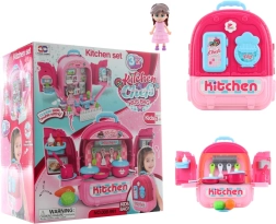 Un set mare și frumos de veselă în rucsac, ideal pentru micile bucătărese. Această jucărie multifuncțională poate servi ca set de bucătărie, set de joacă cu păpușă sau rucsac practic.