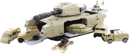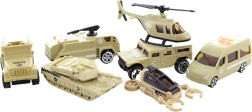 Set militar cu un tanc mare, 6 mașinuțe și 1 elicopter. Material: plastic. Ambalat în cutie. Dimensiunile ambalajului aprox. 46×23,5×11 cm. Vârsta 3+