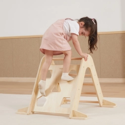 Acest triunghi Pikler este o structură de cățărat din lemn, atent gândită, pentru mișcarea zilnică acasă. Copiii se pot cățăra, pot trece peste sau pe dedesubt în siguranță, își pot antrena prinderea și își pot descoperi abilitățile în spiritul abordării Montessori. Designul pe două fețe – pe o parte scară clasică, pe cealaltă panou de cățărare cu orificii – oferă o provocare variată pentru începători și pentru cățărătorii mai experimentați.