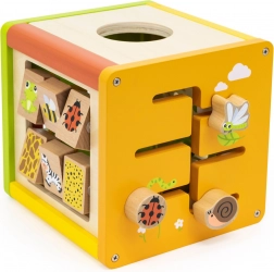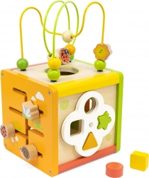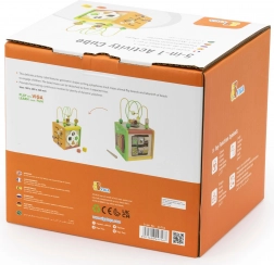 Cubul de activități din lemn 5-în-1 îmbină învățarea cu jocul. Datorită elementelor variate, copilul își antrenează motricitatea fină, recunoașterea formelor și culorilor și coordonarea mână–ochi. Execuția de calitate din lemn și marginile netede asigură o utilizare sigură, iar culorile vii mențin atenția celor mici.