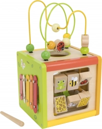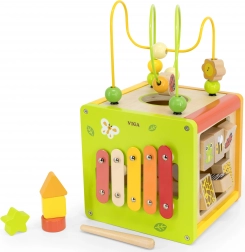 - 5 în 1 (xilofon, sortator de forme, labirint, cubi rotativi, trasee cu mărgele)