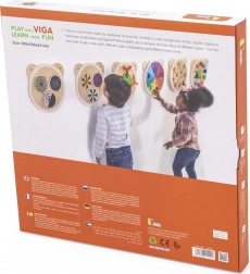 Accent pe siguranță și calitate: produsul este realizat din lemn lăcuit rezistent și colorat cu vopsele netoxice, în nuanțe vii. Jocul dezvoltă în mod natural motricitatea fină, coordonarea, gândirea logică și sprijină recunoașterea culorilor. Gama include o serie întreagă de table de perete în formă de ursuleț, cu funcții diferite – perfecte pentru un colț senzorial modular.